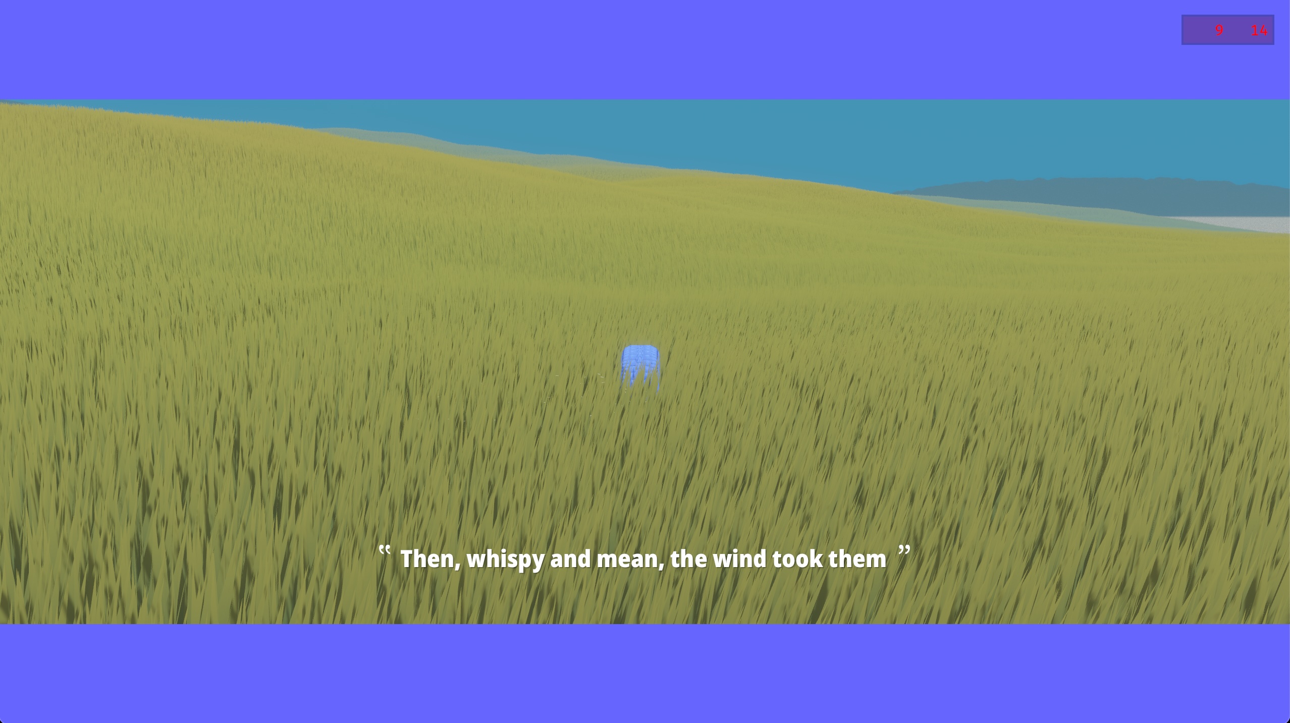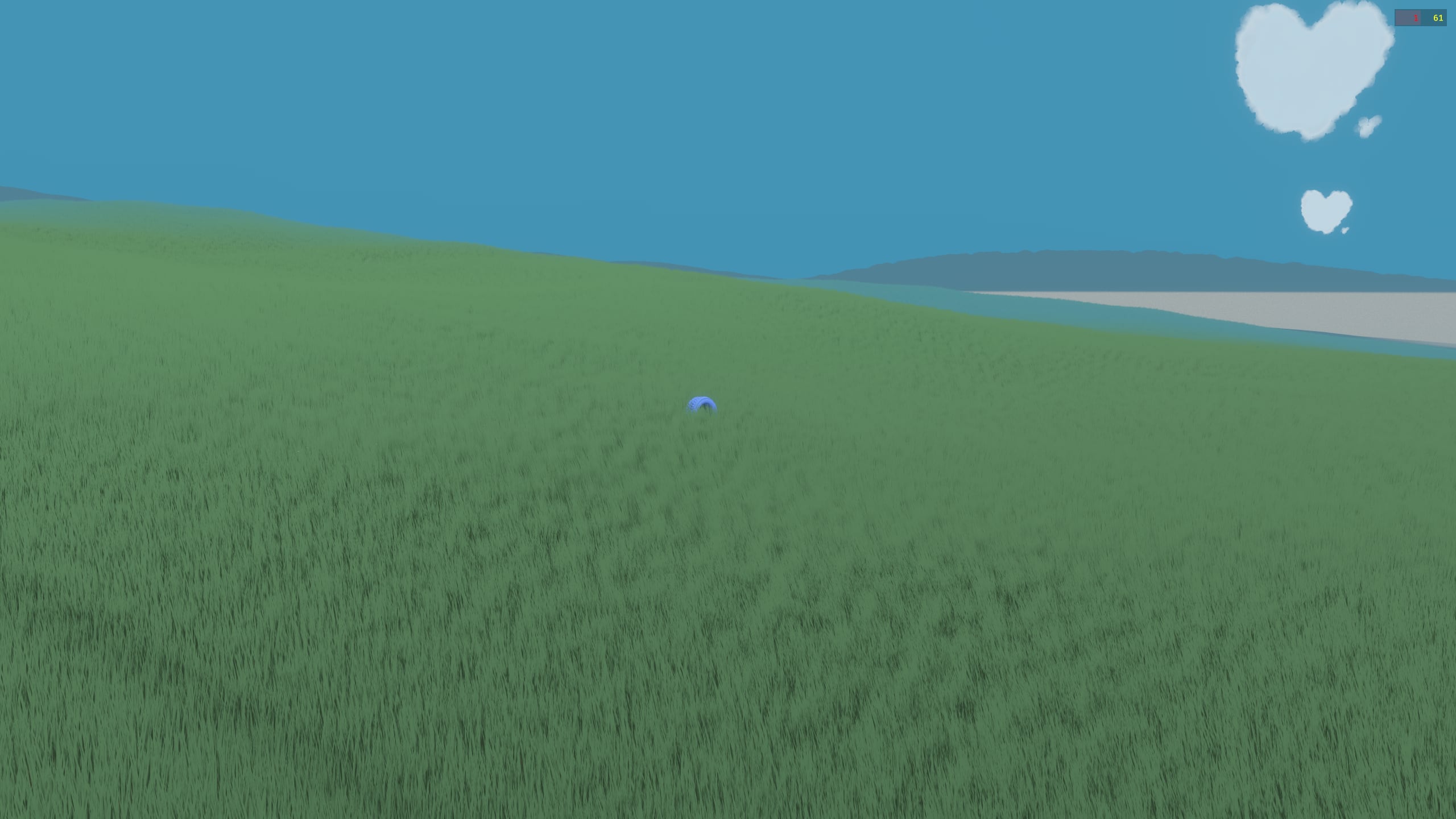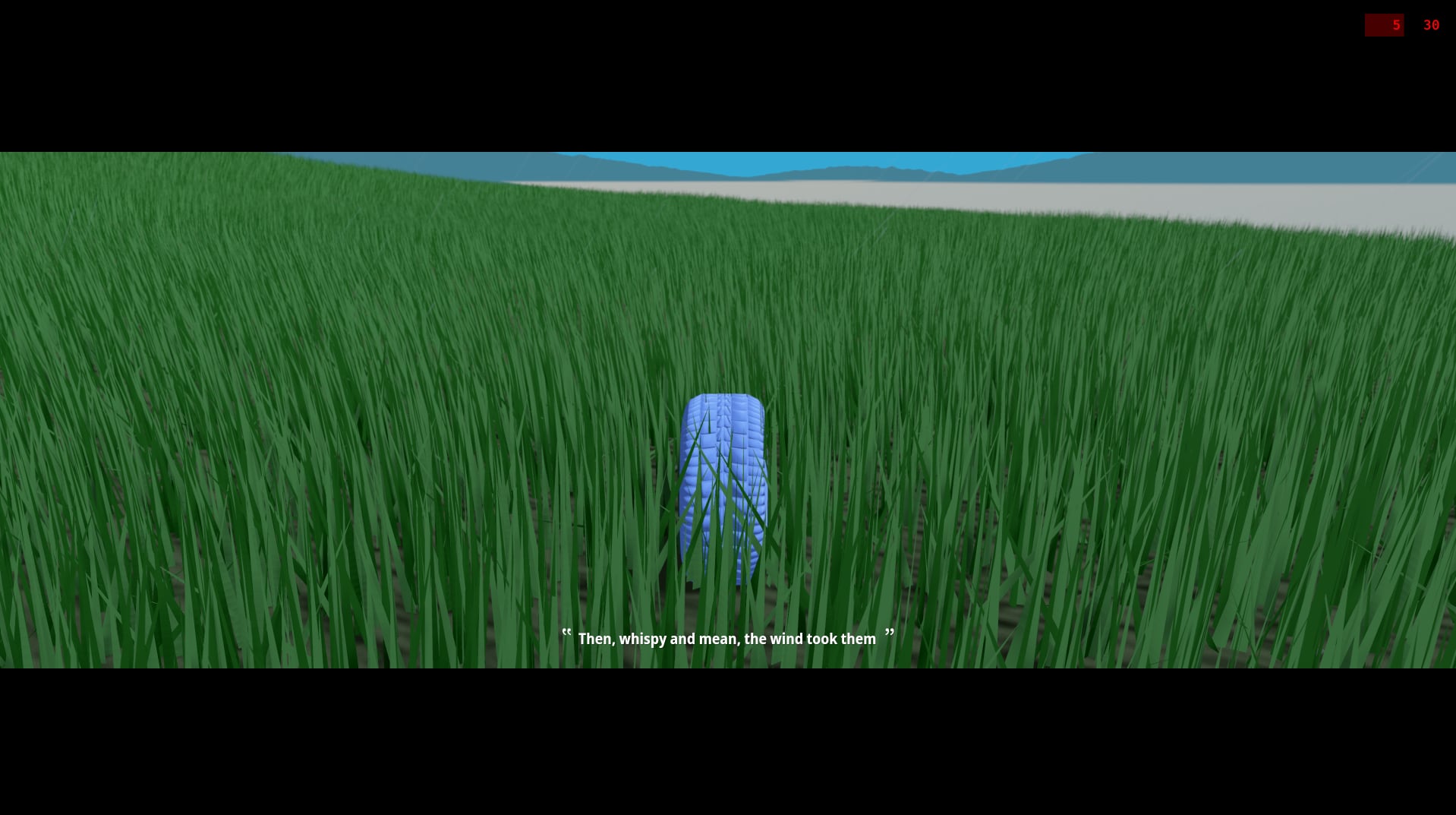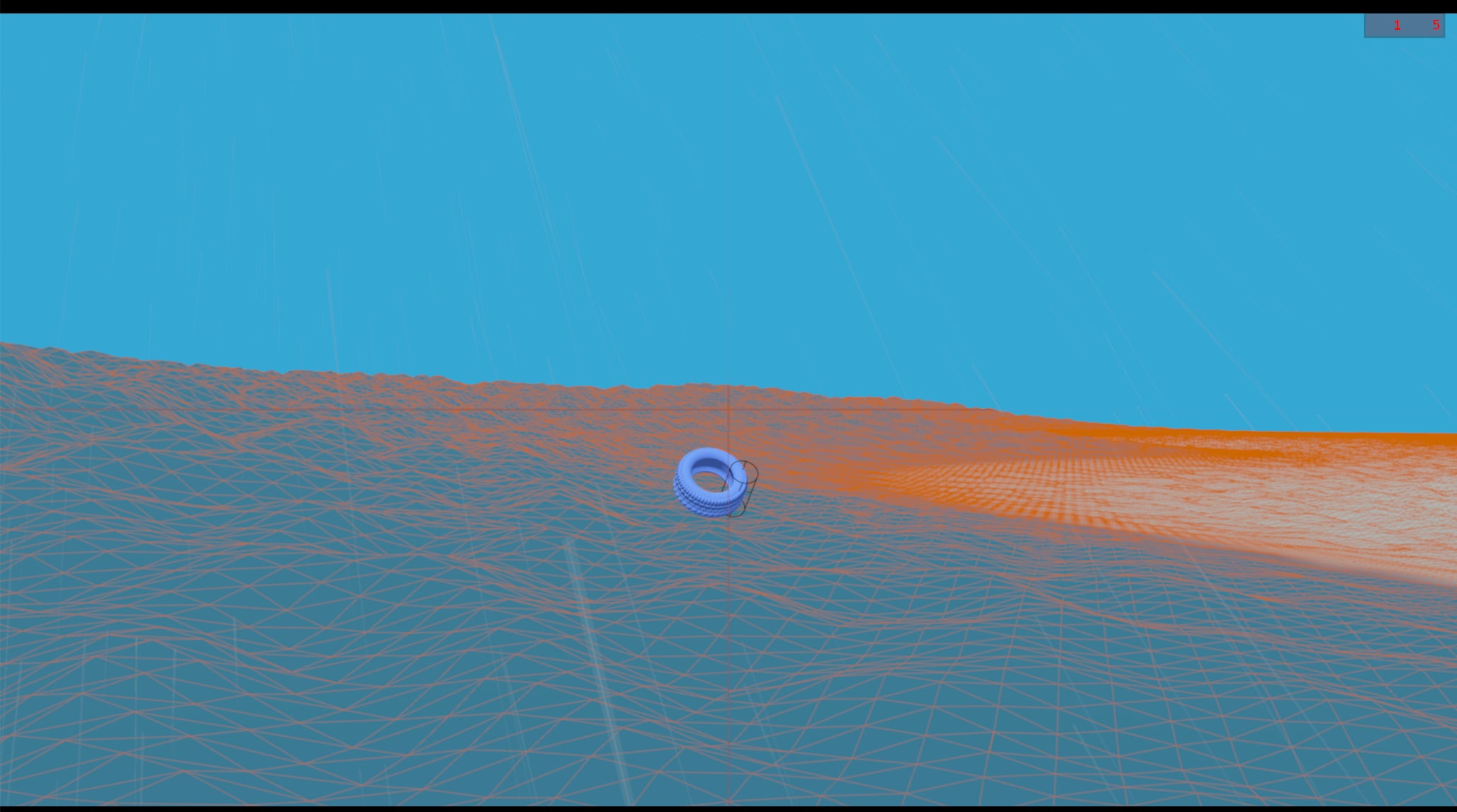 At the start there was no scene. I had a checkerboard pattern floor that the wheel flew around. Next I added a flat plane desert environment. To make the sand more believable I added sand particles. Afterward I wanted terrain with hills, so I copied someone’s example terrain generator. It was ideal, as it added not just dynamic terrain but also waving grass blades.